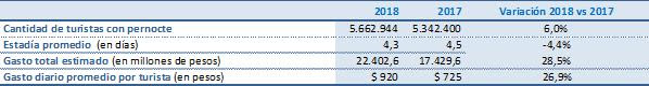 - Por su parte, Chile sigue atrayendo intensamente a los visitantes argentinos. Las cifras difundidas recientemente por la Subsecretaría de Turismo trasandina sorprendieron. Primero, porque durante 2017 llegaron 6.449.883 visitantes extranjeros, de los cuales 3.323.771 fueron argentinos (el 51,53%), un 14,6% más que el año anterior. Segundo, asombraron los 4200 millones de dólares que gastaron (cifra preliminar). Así, por ejemplo, el Paso de Agua Negra, por San Juan, a un mes de su apertura (diciembre 2017) vio cruzar a 5.029 turistas, equivalente a un 74% más de flujo que durante el mismo lapso de la temporada pasada. El pico se presentó en las vísperas de Navidad y Año Nuevo, cuando circularon en promedio 1500 personas por día.
