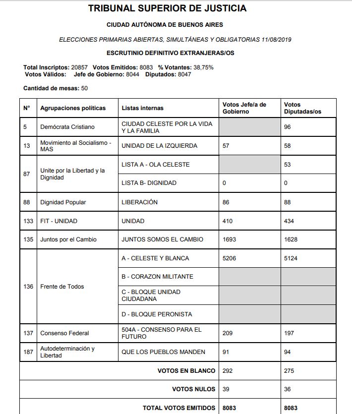 El Tribunal Superior de Justicia de la Ciudad Autónoma de Buenos Aires concluyó el escrutinio definitivo de las mesas de electores extranjeros de las Primarias Abiertas Simultáneas y Obligatorias. Poco más de 8000 electores no nacionales concurrieron a las urnas el pasado domingo. El candidato a Jefe de Gobierno por el Frente de Todos, Matías Lammens, conquistó el 64.71 por ciento de los votos.