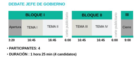 Los cuatro candidatos a Jefe de Gobierno debatirán durante una hora y media, en tres (3) bloques, con dos (2) cortes publicitarios y un (1) cierre. Cada candidato y candidata tendrá un tiempo de exposición de un (1) minuto antes del saludo final.