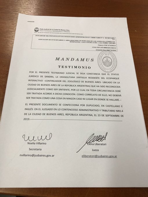 En el escrito firmado por la jueza Elena Liberatori, titular del Juzgado N°4 en lo Contencioso Administrativo y Tributario de la CABA, se deja constancia «del status jurídico de Sandra, la orangutana (antigua residente del Ecoparque Interactivo)», la cual «ha sido reconocida judicialmente como ser sintiente, por lo cual en toda circunstancia debe ser tratada acorde a dicha condición».