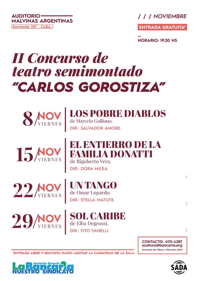 Durante el mes de noviembre tendrá lugar en la Sala Teatral de La Bancaria, ubicada en Sarmiento 341, la muestra de las obras ganadoras del II Concurso de Teatro Semimontado «Carlos Gorostiza».