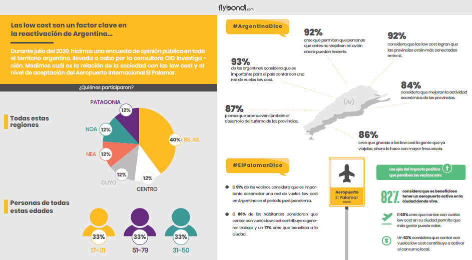 Durante el mes de julio la compañía aérea Flybondi, junto a CIO Investigación, realizó una encuesta de opinión pública en todo el territorio argentino. El objetivo de este estudio fue conocer y entender la relación de la sociedad con el sector de aerolíneas low cost, el nivel de aprobación de la actividad y la valoración respecto del impacto positivo que generan a pocos meses de cumplir 3 años desde que se comenzaron los vuelos low cost en Argentina.