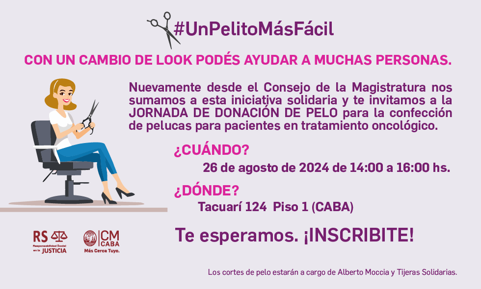El lunes 26 de agosto entre las 14 y las 16 horas, el Programa de Voluntariado del Consejo de la Magistratura de la Ciudad de Buenos Aires organiza una Jornada solidaria de donación de pelo para la confección de pelucas para pacientes en tratamiento oncológico.